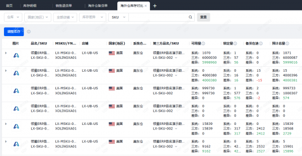 库存实时同步:领星ERP全仓明细页面汇总本地、海外、平台等多仓数据,快速掌握即时库存情况,自动实时同步对接海外仓的库存数量,减少异常库存变动导致的信息滞后。