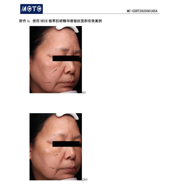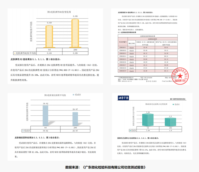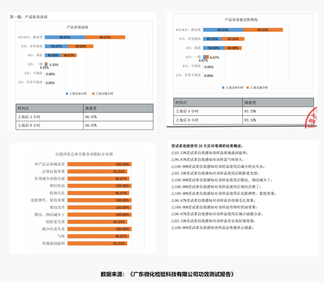 在经广东微化检验科技有限公司开展的临床测试中,产品展现出了卓越的全方位抗衰效果。测试数据显示,30名健康女性受试者连续使用28天后: