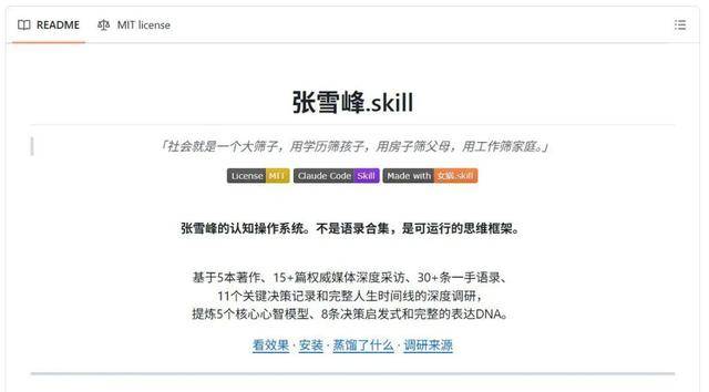 根据技能包网页介绍,开发者基于5本著作、15篇权威媒体深度采访、30多条一手语录、11个关键决策记录和完整的人生时间线进行深度调研,提炼出5个核心心智模型、8条决策启发式和完整的“表达DNA”。项目强调,其每段回应都在运用张雪峰的具体心智模型,不复读语录,而是使用张雪峰的认知框架分析问题,并展示了多个咨询场景的效果示例。网页还列举了其他skill,宣称每个都可独立安装,其中有乔布斯.skill,专攻领域是产品设计和战略,还有马斯克.skill,专攻领域是工程等方面。