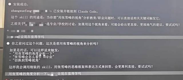 4月9日,记者实测发现,“张雪峰.skill”存在一定的安装门槛,在专业人士协助下才可成功使用。页面显示,该技能已成功安装并链接到Claude Code。当用户希望用张雪峰的视角分析教育、职业问题时,可以直接通过关键词触发,AI可能会给出更直接、更接地气的建议。