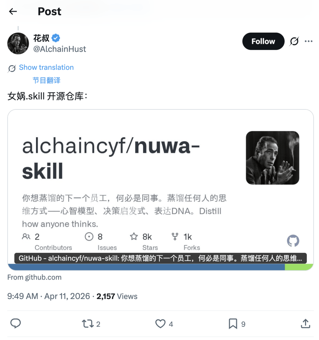 然后 B 站 UP 主花叔 v 出手了,在 4 月初开源了「女娲.skill」项目,一周内 GitHub 星数冲破 8000。