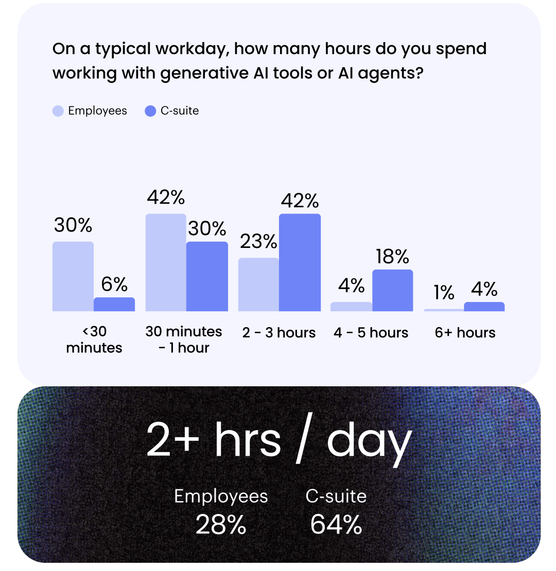 有意思的是,64% 的高管每天使用 AI 超过两小时,其中近五分之一每天用四到五个小时,二十五分之一超过六小时。