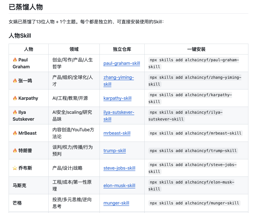 女娲的官方示例蒸馏了乔布斯、马斯克、芒格、费曼、Naval、塔勒布等十几位人物。每个 Skill 都可以直接在 Claude Code 里安装使用。