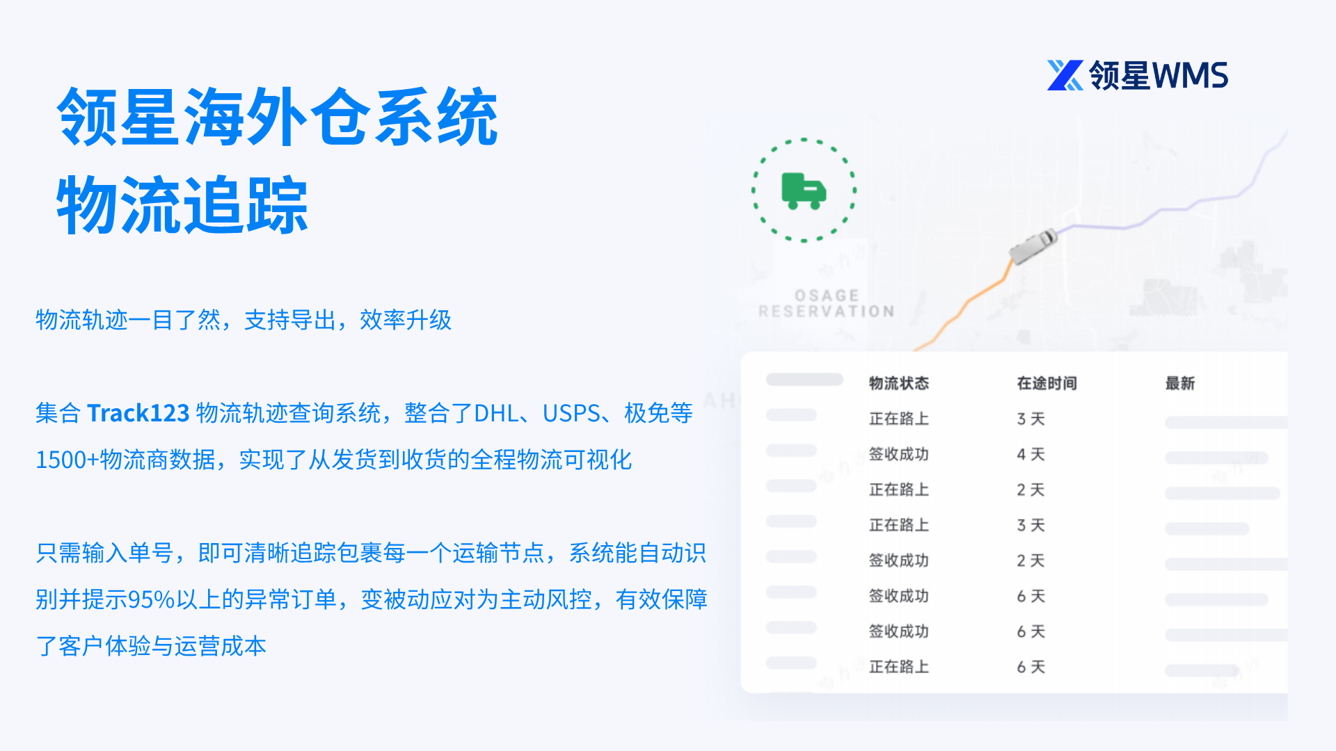 接下来就是海外仓用尾程安排货物装车派送,在出库配送流程中海外仓需要确保出库准确性,也需要为客户实时提供物流信息。上面第三步骤提到领星WMS集成很多平台,比如领星海外仓系统集合Track123物流轨迹查询系统,整合了DHL、USPS、极兔等1500+物流商数据,只需输入单号,即可清晰追踪包裹每一个运输节点。系统能自动识别并提示95%以上的异常订单,变被动应对为主动风控,有效保障了客户体验与运营成本。