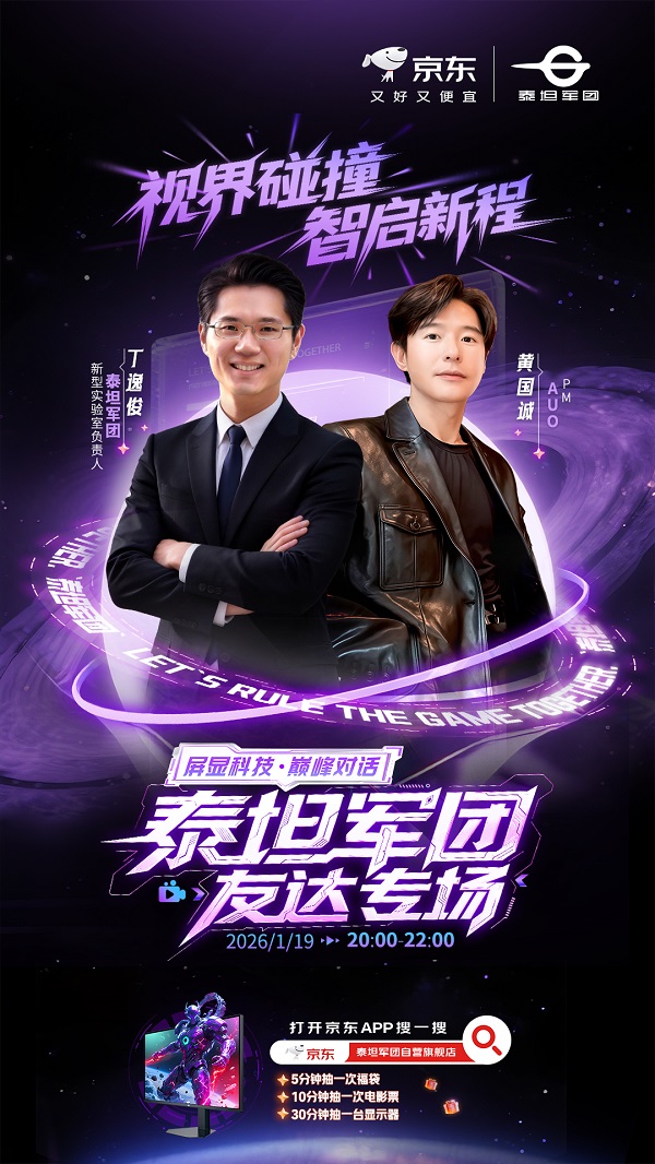 为让更多用户深入了解“自研技术 + 高端面板方案”的协同优势,泰坦军团特邀友达光电(AUO)PM 黄国诚,于 2026 年 1 月 19 日 20:00–22:00 开启主题为 “视界碰撞 智启新程” 的专场直播。直播期间,泰坦军团新型显示实验室总负责人丁逸俊(业内称“丁老师”,亦为数码博主“耗子与喵”)将与黄国诚(PM)进行深度对话,围绕显示器面板技术的趋势演进展开解析,重点拆解行业关键变量与可能的技术路线。同时,泰坦军团主播番茄、西红柿将全程助阵,结合实际使用场景,为观众推荐多款搭载友达面板的泰坦军团电竞显示器,并带来多重直播福利派送。